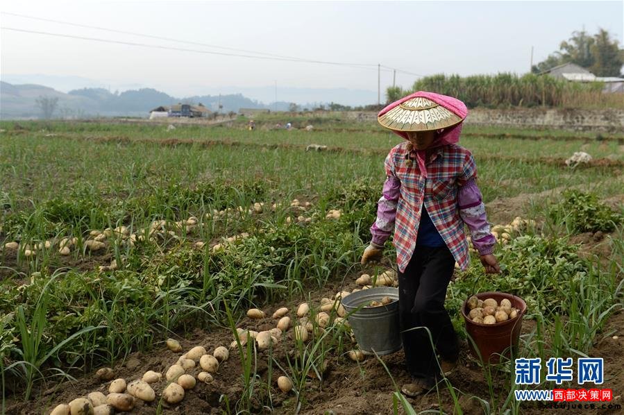 云南省德宏傣族景頗族自治州芒市軒崗鄉(xiāng)農(nóng)民提著采挖好的馬鈴薯準備前去裝箱。當?shù)伛R鈴薯每畝產(chǎn)值近6000元,是村民增收的主要途徑之一(2014年3月21日攝)。近年來,云南省大力推進扶貧攻堅,走出了一條整村、整鄉(xiāng)、整縣、整州推進的扶貧開發(fā)新路子。黨的十八大以來,以習近平同志為總書記的黨中央高瞻遠矚、深謀遠慮,以高度的政治感、使命感和責任感,把扶貧開發(fā)工作提升至治國理政新高度,廣泛凝聚社會各界力量,推進實施精準扶貧方略,為到2020年全面建成小康社會奠定堅實基礎(chǔ)。按照中央部署,通過產(chǎn)業(yè)扶持、轉(zhuǎn)移就業(yè)、易地搬遷、政策兜底等方式,到2020年將實現(xiàn)7017萬農(nóng)村貧困人口脫貧目標。新華社記者 胡超 攝