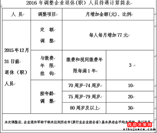 根據(jù)國家規(guī)定,2016年調(diào)整退休人員基本養(yǎng)老金,采取定額調(diào)整、掛鉤調(diào)整與適當(dāng)傾斜相結(jié)合的辦法。定額調(diào)整重點(diǎn)體現(xiàn)社會(huì)公平。掛鉤調(diào)整要體現(xiàn)“多工作、多繳費(fèi)、多得養(yǎng)老金”的激勵(lì)機(jī)制,可與退休人員本人繳費(fèi)年限(或工作年限)、基本養(yǎng)老金水平等因素掛鉤。企業(yè)應(yīng)兼顧繳費(fèi)年限掛鉤和基本養(yǎng)老金水平掛鉤,體現(xiàn)長繳多調(diào)、多繳多調(diào)。機(jī)關(guān)事業(yè)單位可主要與養(yǎng)老金水平掛鉤,也可以考慮工作年限、職務(wù)職級(jí)等因素,但不宜簡單按職務(wù)職級(jí)確定具體標(biāo)準(zhǔn)。對(duì)高齡退休人員可適當(dāng)提高調(diào)整水平。對(duì)基本養(yǎng)老金偏低的企業(yè)退休軍轉(zhuǎn)干部,繼續(xù)確保其基本養(yǎng)老金不低于當(dāng)?shù)仄髽I(yè)退休人員平均水平。