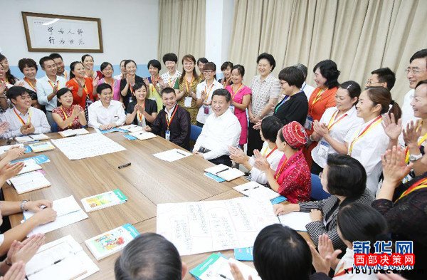 (2014年9月9日,習(xí)近平來到北京師范大學(xué)看望教師學(xué)生,向全國廣大教師和教育工作者致以崇高的節(jié)日敬禮和祝賀。這是習(xí)近平同正在北師大參加“中小學(xué)教師國家級培訓(xùn)計劃”的貴州小學(xué)骨干語文教師交流。新華社記者姚大偉攝)