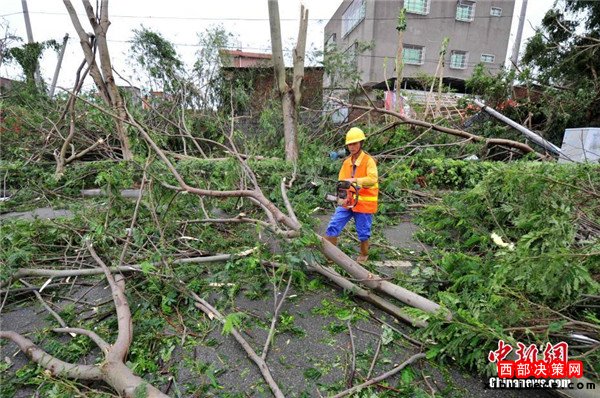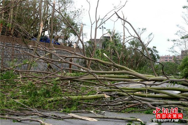 9月15日,今年第14號臺風“莫蘭蒂”于凌晨3時05分在廈門翔安沿海登陸,登陸時中心附近最大風力15級(48米/秒,強臺風級),中心氣壓945百帕。圖為廈門市區(qū)路上大批車輛被吹倒的樹木損壞。