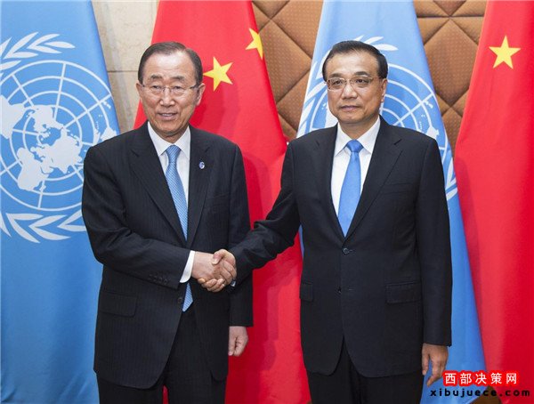 7月8日,國(guó)務(wù)院總理李克強(qiáng)在北京會(huì)見來(lái)華訪問(wèn)的聯(lián)合國(guó)秘書長(zhǎng)潘基文。