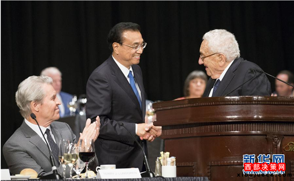 李克強表示,基辛格博士45年前訪華時,中美貿(mào)易幾乎為零。45年后的今天,中美貿(mào)易額占全世界貿(mào)易總量的五分之一,中美經(jīng)濟總量之和占世界經(jīng)濟總量的三分之一。我們的貿(mào)易和投資量如此之大,自然難免有分歧摩擦,但我們之間的共同利益遠大于誤解和分歧。我們正在進行的雙邊投資協(xié)定談判就是向兩國工商界發(fā)出中美進一步擴大相互開放和投資的積極信號。希望美方采取務實靈活態(tài)度,與中方共同努力達成高水平、互利共贏的雙邊投資協(xié)定。兩國可以通過更多貿(mào)易與人員往來,坦誠溝通,增進理解與互信,推動中美關系朝著穩(wěn)定向好的方向繼續(xù)前行。