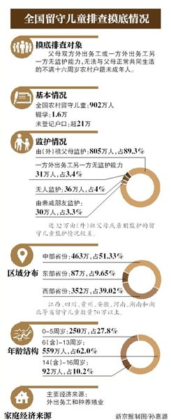 在昨日召開的農(nóng)村留守兒童關(guān)愛保護工作部際聯(lián)席會議上,民政部副部長高曉兵透露了此次摸底排查的結(jié)果。據(jù)她介紹,此次摸底排查開始于今年3月底,排查結(jié)果顯示,全國農(nóng)村留守兒童902萬人。