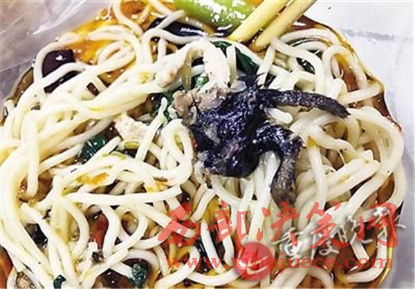 鄒燕介紹,她和同事經(jīng)常去附近張口面館子就餐,也經(jīng)常點(diǎn)這家店的外賣。19日下午,她通過(guò)美團(tuán)外賣點(diǎn)了該店酸菜肉絲面和番茄丸子面各一兩,吃酸菜肉絲面時(shí)發(fā)現(xiàn)一塊黑乎乎東西,仔細(xì)一看像老鼠腿,當(dāng)時(shí)就惡心得吃不下去了。