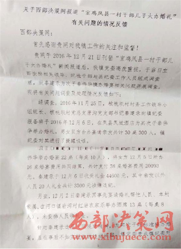 西部決策網(wǎng)訊(任書彥) 本網(wǎng)2016年12月21日刊文《寶雞鳳縣一村干部兒子大辦婚禮》報道鳳縣河口鎮(zhèn)唐溝村支部書記秦建錄直接挑戰(zhàn)中央八項規(guī)定,為兒子大辦婚禮。經(jīng)寶雞市紀委批示鳳縣紀委從嚴查處。