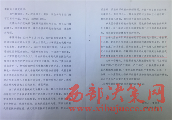 當(dāng)事人魯鋼軍于2016年3月16號(hào)在石門鎮(zhèn)政府會(huì)議室被傷,而致他受傷的當(dāng)事人鄭自安還升任石門鎮(zhèn)副鎮(zhèn)長,而這個(gè)新任鎮(zhèn)長鄭自安就是上訪人向旬陽縣委組織部實(shí)名舉報(bào)長期聚賭的主要人物。而鄭自安賭博并非偶爾賭一兩次,而是長期聚賭,鄭自安和上訪人魯鋼軍結(jié)怨就是在前幾年上訪人在上訪過程中認(rèn)識(shí)的。鄭自安讓上訪人介紹賭友認(rèn)識(shí)聚賭而對上訪人有怨氣。石門鎮(zhèn)難道是特區(qū)要以賭博產(chǎn)業(yè)為龍頭嗎?否則怎么會(huì)讓一個(gè)賭徒任鎮(zhèn)長?2016年3月16日在鎮(zhèn)政府辦公室致使魯剛軍尾椎體滑脫,造成多日生活部分失去自理能力。就因種種事由,魯剛軍曾多次向旬陽縣紀(jì)委、安康市組織部、安康市紀(jì)委反映,至今未得到妥善處理。