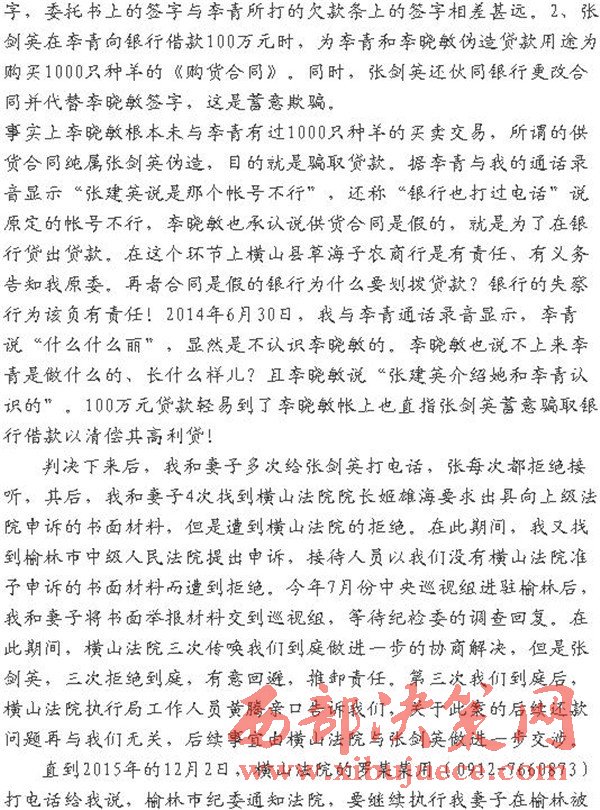 判決下來后,我和妻子多次給張劍英打電話,張每次都拒絕接聽,其后,我和妻子4次找到橫山法院院長姬雄海要求出具向上級法院申訴的書面材料,但是遭到橫山法院的拒絕。在此期間,我又找到榆林市中級人民法院提出申訴,接待人員以我們沒有橫山法院準予申訴的書面材料而遭到拒絕。今年7月份中央巡視組進駐榆林后,我和妻子將書面舉報材料交到巡視組,等待紀檢委的調(diào)查回復(fù)。在此期間,橫山法院三次傳喚我們到庭做進一步的協(xié)商解決,但是張劍英,三次拒絕到庭,有意回避,推卸責任。第三次我們到庭后,橫山法院執(zhí)行局工作人員黃騰親口告訴我們,關(guān)于此案的后續(xù)還款問題再與我們無關(guān),后續(xù)事宜由橫山法院與張劍英做進一步交涉。