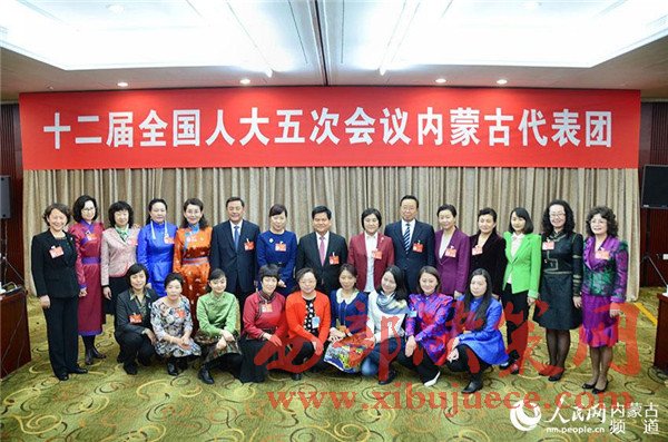 內(nèi)蒙古代表團的代表們與現(xiàn)場女記者合影留念。