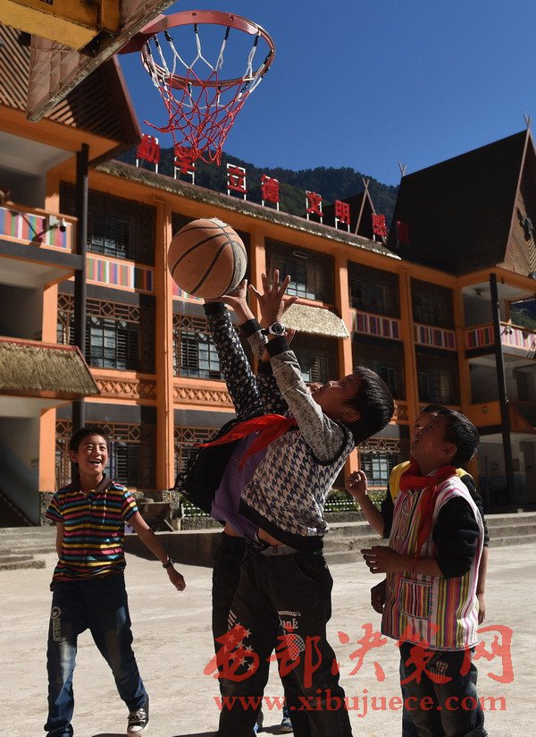 這是云南省貢山獨龍族怒族自治縣獨龍江鄉(xiāng)中心小學(xué)的獨龍族學(xué)生在新建成的教學(xué)樓前打籃球(2016年11月23日攝)。