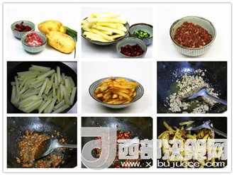 第四步:鍋中倒入適量的油(比平時炒菜的量要多一點(diǎn)),然后把土豆條放入鍋中,中小火開始煸炒。