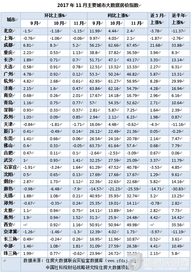 2017年11月大數(shù)據(jù)房?jī)r(jià)指數(shù)監(jiān)測(cè)發(fā)現(xiàn),一線城市房?jī)r(jià)全面停漲,其中北京、上海繼續(xù)下跌,環(huán)京板塊累計(jì)跌幅較大;二線城市中除了成都、南京等少數(shù)城市外房?jī)r(jià)均相對(duì)穩(wěn)定;熱點(diǎn)三四線城市如佛山、東莞、合肥、無錫等也趨于停漲。