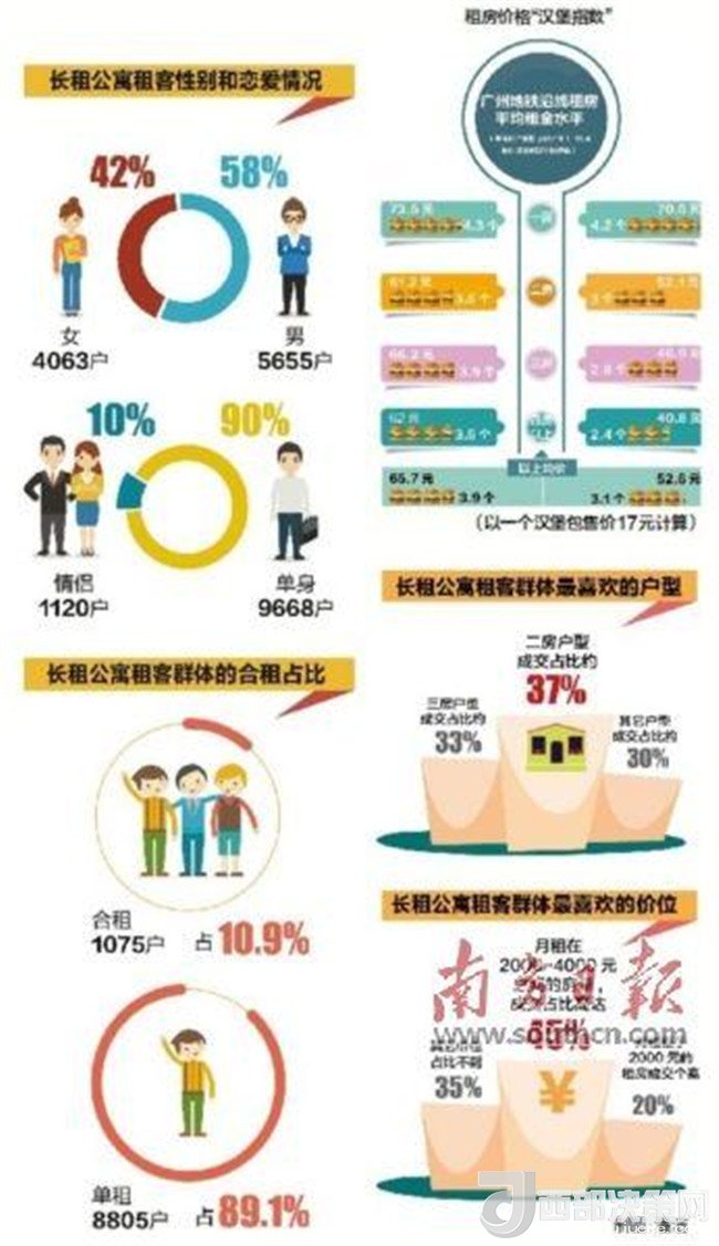 那么,對(duì)廣州這座全國(guó)主要的一線城市來(lái)說(shuō),目前的住房租賃市場(chǎng)和租房的情況與其他城市有何不同呢?最近,南方日?qǐng)?bào)、南方+聯(lián)合萬(wàn)科泊寓、廣州中原地產(chǎn)等企業(yè)機(jī)構(gòu),在“租房時(shí)代”南方號(hào)向廣大網(wǎng)友和住房租賃行業(yè)人士推出了“廣州地鐵沿線住房平均租金漢堡指數(shù)”、“長(zhǎng)租公寓租房群體畫(huà)像”等系列大數(shù)據(jù)分析產(chǎn)品。