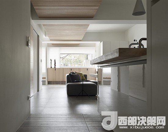 站在長廊一頭視線忍不住會跟著木質頂板向前眺望,一直延伸至窗外,室外的采光經(jīng)過漫反射幾乎可以引入整個客廳。