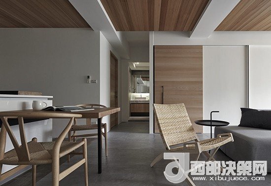 原木和灰色的主線搭配中加入了一只淡黃色抱枕點綴,既不破壞整體的恬淡舒適,又能使空間顯得更加有活力。