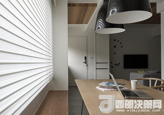 為了符合簡單純粹的設計理念,沒有電視柜的背景墻上放置了一個藝術時鐘,可移動的數(shù)字設計展現(xiàn)了一種道家的精神。