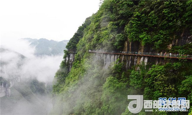 5月1日,游客在湖南省吉首市的懸崖棧道上游覽。當日,吉首市雨過天晴,山區(qū)云霧縹緲,變幻多姿。新華社發(fā) 姚方 攝