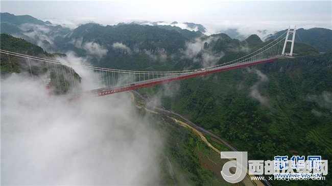 5月1日,湖南省吉首市矮寨大橋周邊云霧繚繞。當日,吉首市雨過天晴,山區(qū)云霧縹緲,變幻多姿。新華社發(fā) 龍恩澤 攝