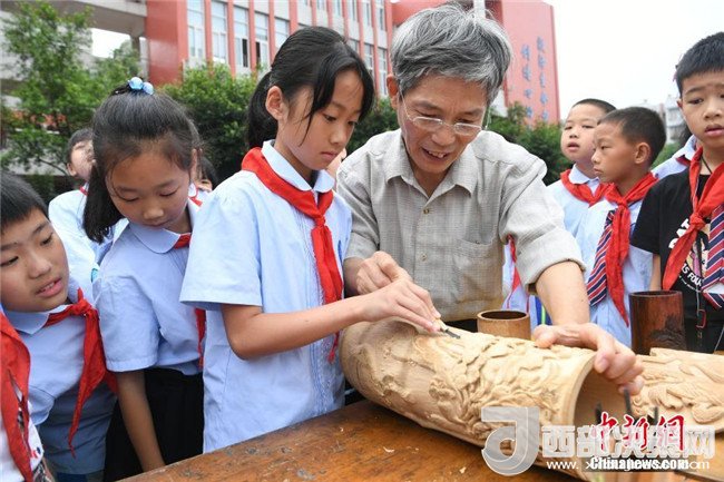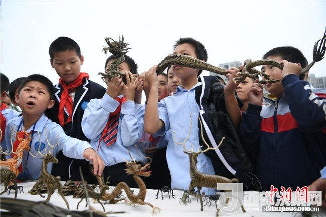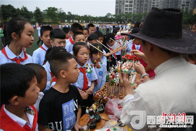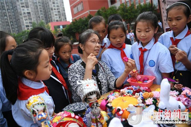 活動(dòng)現(xiàn)場,15個(gè)國家級和市級非物質(zhì)文化遺產(chǎn)項(xiàng)目為重慶沙坪壩西永第一小學(xué)校的師生帶來一場豐盛文化遺產(chǎn)大餐,讓師生們近距離感受了中華優(yōu)秀傳統(tǒng)文化的魅力。圖為活動(dòng)現(xiàn)場學(xué)生們參觀非物質(zhì)文化遺產(chǎn)項(xiàng)目。 陳超 攝