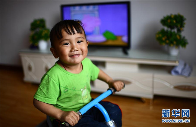 6月13日,在河南蒙古族自治縣易地扶貧搬遷安置小區(qū)幸福家園,智后茂村牧民旦卻卓瑪?shù)膬鹤恿_藏智華在家中玩耍。新華社記者 張宏祥 攝