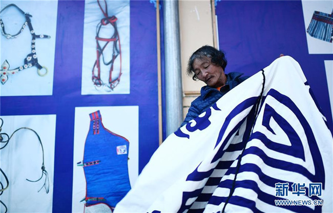 6月13日,在河南蒙古族自治縣那日宗畜牧業(yè)牧民專業(yè)合作社民族服裝加工廠,荷日恒村牧民卓瑪加在整理制作的帳篷。新華社記者 張宏祥 攝