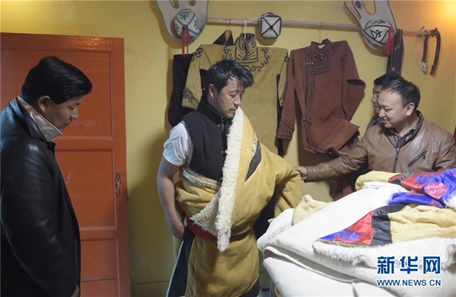 6月13日,在河南蒙古族自治縣那日宗畜牧業(yè)牧民專業(yè)合作社民族服裝加工廠,工廠負責人才讓東知(左二)在為客人展示蒙古族服裝。新華社記者 魯鵬 攝