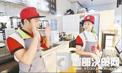 6月21日,在貴陽市貴陽北站一家名為“無聲飲品”的飲料店內,服務員在用手語相互交流。從點單到付款,再到制作交遞,店員和顧客間都通過手語或手寫紙條進行交流。這家小店是貴陽市盲聾啞學校的校企合作項目,店內所有服務人員均是聾啞學生。截至目前,貴陽已有4家“無聲飲品”店,為近50名聾啞學生提供了實習和就業(yè)平臺。歐東衢攝