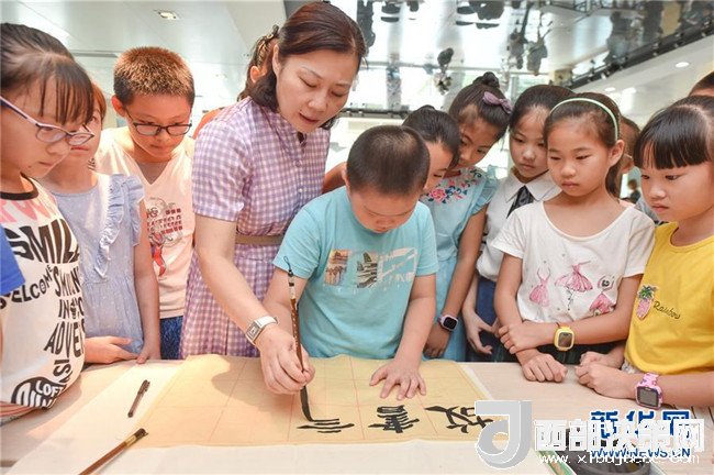 7月24日,在福建省少年兒童圖書館,省級書法名師、福州市烏山小學(xué)校長方曉敏在指導(dǎo)小營員們習(xí)字。