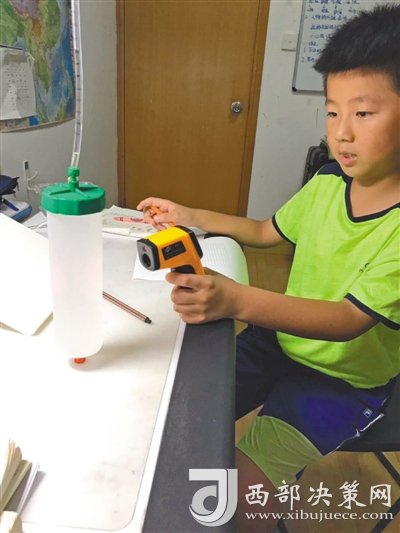首先設(shè)計(jì)一個(gè)裝置,下部寬大的容器盛水,上部細(xì)長(zhǎng)的管子可以觀察水的體積變化。然后將裝滿水的容器放入冰箱冷凍層,形成冰水混合物,此時(shí)水溫接近零攝氏度。最后將容器取出,用手持式測(cè)溫儀測(cè)量水溫……這一系列步驟,不是實(shí)驗(yàn)室里進(jìn)行的專業(yè)研究,而是南京師范大學(xué)附屬小學(xué)四年級(jí)學(xué)生徐子越和王美澄正在做的暑假作業(yè),他們通過觀察水的體積隨溫度的變化,來解釋冰為什么會(huì)浮在水面上。
