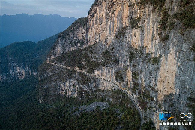 稱其“懸崖天路”,來源于其險要的地勢——上方是巖石,外側(cè)是懸崖峭壁。由于地處海拔1500米的高山,常有云霧繚繞,驚險萬分。新華網(wǎng) 李相博 攝