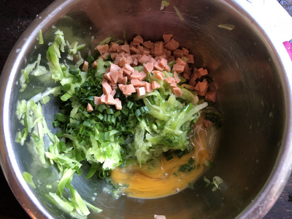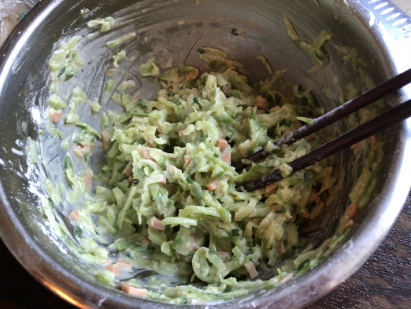 3.把蘿卜絲擠干水分,加入提前切好的火腿炒丁、雞蛋、白胡椒粉、五香粉、雞粉、蔥花拌勻