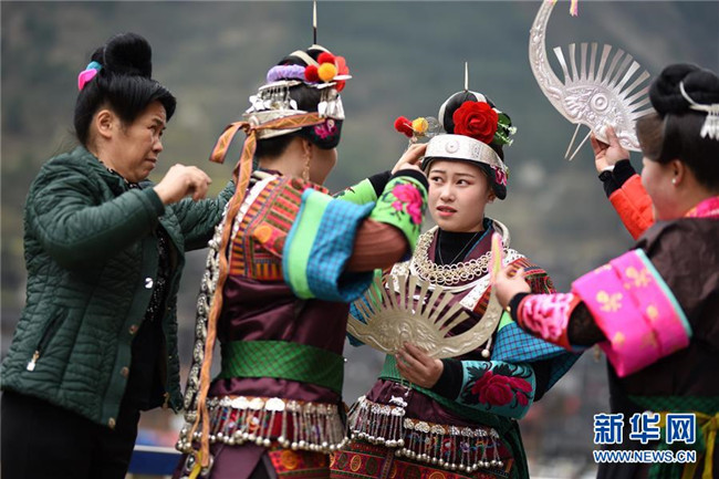 3月16日,在丹寨縣南皋鄉(xiāng)清江村,苗族姑娘為翻鼓節(jié)悉心打扮。 當(dāng)日,貴州省黔東南苗族侗族自治州丹寨縣南皋鄉(xiāng)清江村清江村舉行翻鼓節(jié)。翻鼓節(jié)是當(dāng)?shù)孛缱宕迕裼哟焊絹?lái)的民俗節(jié)日,至今已有近600年歷史,每年農(nóng)歷二月舉行。 新華社記者 楊文斌 攝