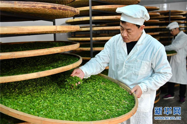 4月10日,平定縣冠山鎮(zhèn)后溝村的村民在整理包裝好的連翹茶。
