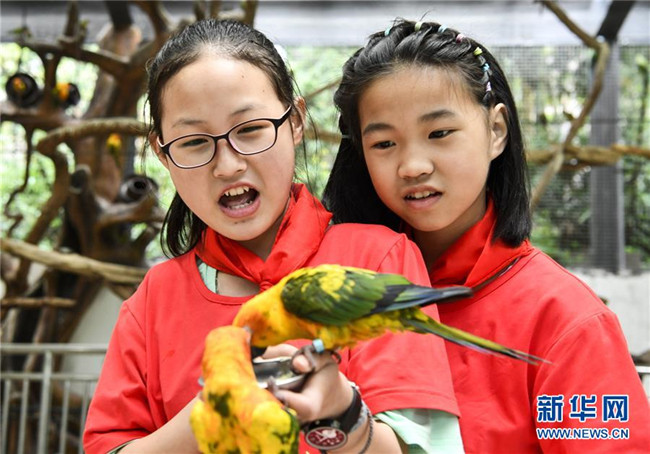 5月29日,在重慶市動(dòng)物園內(nèi)的互動(dòng)區(qū),蓼子鄉(xiāng)第一中心小學(xué)的學(xué)生們給鸚鵡喂食。新華社記者 劉潺 攝