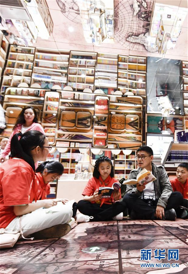 5月29日,在重慶市九龍坡區(qū)一家書店內(nèi),重慶鐵路小學(xué)的老師鄧賢莎(右二)和蓼子鄉(xiāng)第一中心小學(xué)的學(xué)生一起讀書。新華社記者 劉潺 攝