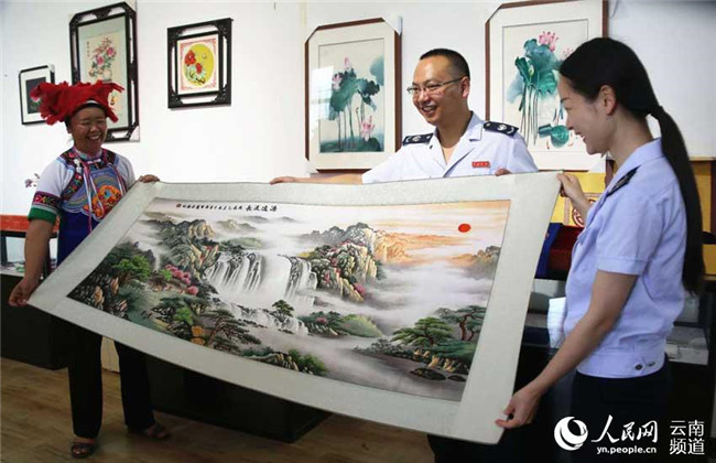 沉下心來學(xué)習(xí)刺繡的王陸芬朝著自己的小目標(biāo)努力。白天,她向村里的老人們學(xué)習(xí)刺繡技法,學(xué)習(xí)構(gòu)圖、畫圖,晚上就在家里刻苦練習(xí)。一有機會,王陸芬就出去考察學(xué)習(xí)。“有一年去上??疾?,看到他們的刺繡還沒有我做的精細(xì),沒想到價格還很貴。”這讓王陸芬堅定了自己的想法,在王陸芬的帶動下,白沙坡村成立了刺繡協(xié)會,協(xié)會一開始只有26人。2014年2月,技藝日臻成熟的王陸芬成立了“紙藝刺繡農(nóng)民專業(yè)合作社”,2015年成立硯山縣華韻手工刺繡有限公司。