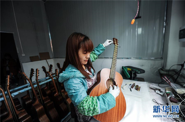 調(diào)音師在貴州省正安縣“正安·國際吉他產(chǎn)業(yè)園”為吉他校對音準(2017年3月28日攝)。新華社記者 陶亮 攝