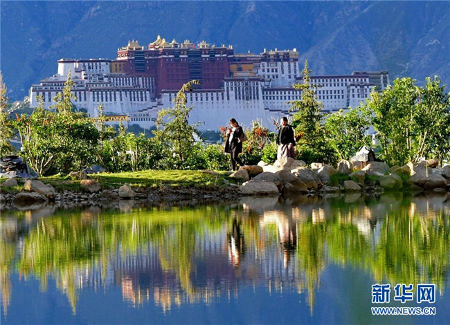 在南山公園湖畔拍攝的布達拉宮風光(7月30日攝)。新華社記者 張汝鋒 攝