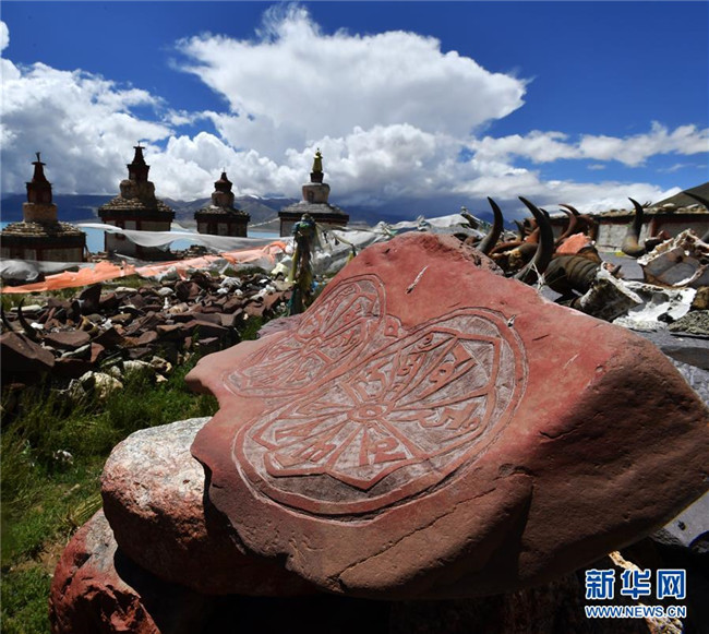 當(dāng)惹雍錯旁的象雄佛塔及經(jīng)石(8月5日攝)。西藏那曲市尼瑪縣位于西藏西北部,位于羌塘國家級自然保護區(qū)內(nèi),是古老象雄文明的發(fā)祥地之一。這里空氣潔凈,野生動物繁多,深受游客喜愛。新華社記者覺果攝