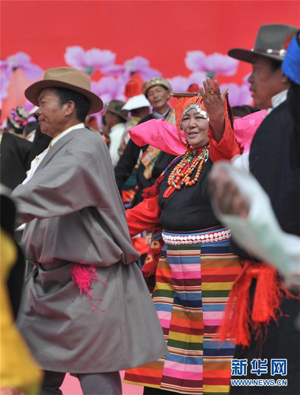 9月29日,演員在聯(lián)歡活動(dòng)中表演西藏傳統(tǒng)歌舞。新華社記者晉美多吉攝