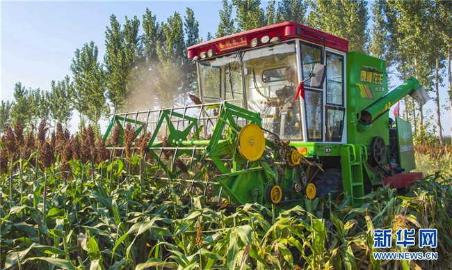 10月7日,在棗強縣肖張鎮(zhèn)西趙莊村,村民使用收割機收割高粱。 新華社記者 李曉果 攝