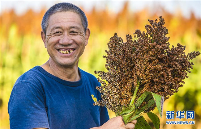 10月7日,在棗強縣肖張鎮(zhèn)西趙莊村,村民展示收獲的高粱。 新華社記者 李曉果 攝