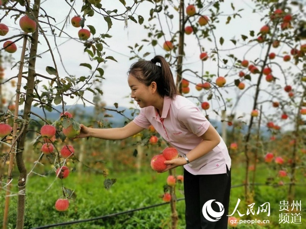 游客在桐梓縣官倉鎮(zhèn)蘋果種植基地體驗(yàn)采摘樂趣。王欽 攝