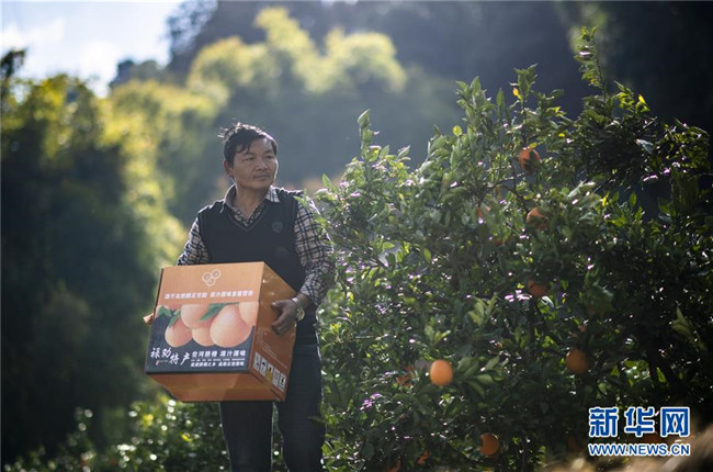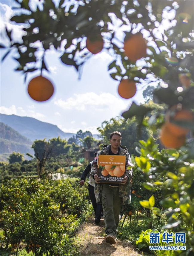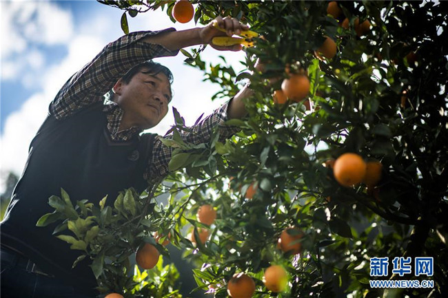 1月8日,云南省昆明市祿勸彝族苗族自治縣屏山街道岔河村農(nóng)戶宋玉才在采收臍橙。 新華社記者 江文耀 攝