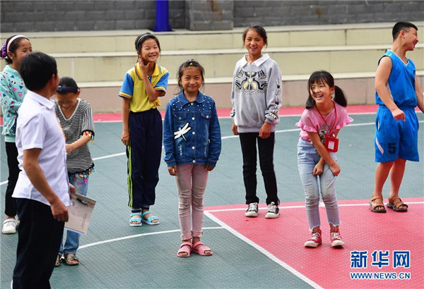 在廣西融水苗族自治縣桿洞鄉(xiāng)黨鳩小學(xué),學(xué)生在新球場(chǎng)上跳繩(5月13日攝)。新華社記者黃孝邦攝