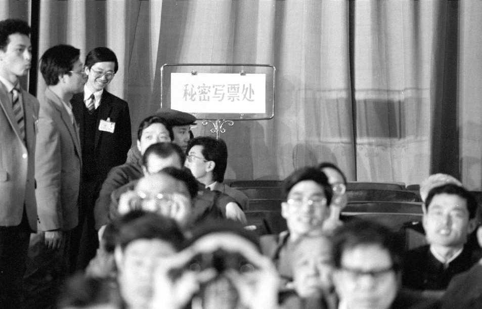 1988年4月,七屆全國(guó)人大一次會(huì)議第六次全體會(huì)議,投票選舉國(guó)家機(jī)構(gòu)領(lǐng)導(dǎo)人。圖為首次設(shè)立的秘密寫票處。