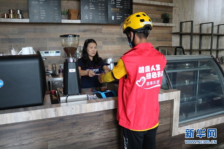 送完這一單后,周歡匆匆趕往下一個(gè)送餐點(diǎn)。“未來,將有更有人在點(diǎn)外賣時(shí),不僅會收到美食,還會收獲一份特殊的‘禁毒外賣’”。新華網(wǎng)發(fā) (滕華 攝)