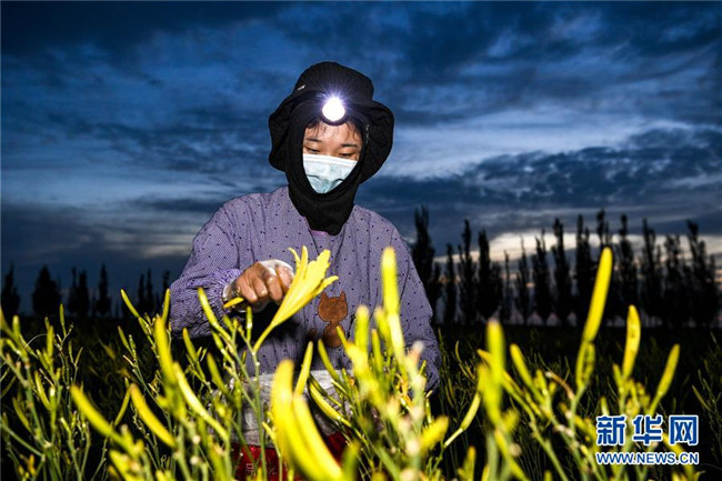 7月16日,在寧夏鹽池縣惠安堡鎮(zhèn)大壩村,農(nóng)民在日出前采摘黃花菜。新華社記者 馮開(kāi)華 攝