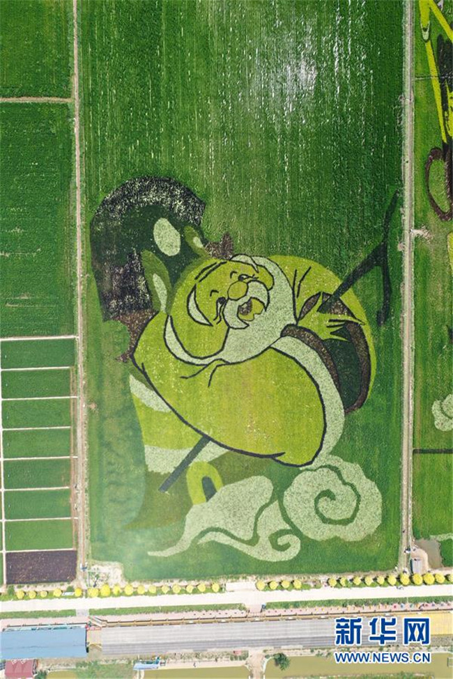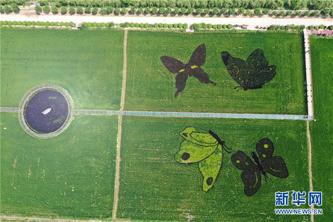 這是寧夏賀蘭縣稻漁空間鄉(xiāng)村生態(tài)觀光園內(nèi)的稻田畫(7月22日攝,無人機照片)。新華社記者 劉海 攝