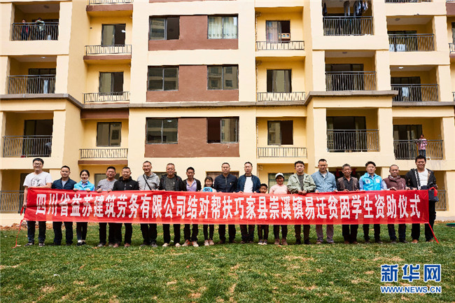 經過中建二局志愿者的牽線搭橋,四川一勞務公司老板涂永林決定資助李本艷姐弟倆到大學畢業(yè)。在李本艷的新家樓下,雙方舉行了簡單的資助儀式(攝于4月3日)。新華網(wǎng)發(fā)(鮑禹 攝)