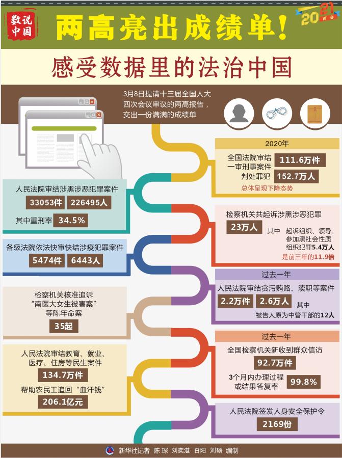 8日提請(qǐng)十三屆全國(guó)人大四次會(huì)議審議的兩高報(bào)告,交出一份滿(mǎn)滿(mǎn)的成績(jī)單。掃黑除惡“打傘破網(wǎng)”、嚴(yán)懲腐敗守護(hù)平安、加強(qiáng)民生司法保障……一串串?dāng)?shù)字勾勒出法治中國(guó)建設(shè)的亮點(diǎn)。